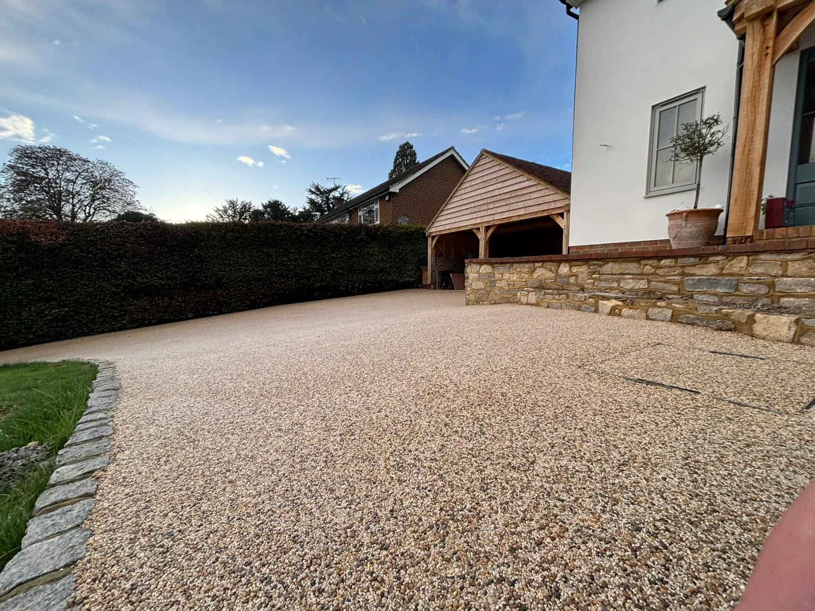 Maintenance is simple, just occasional sweeping and light jet washing. The surface remains clean, weed-resistant, and low-maintenance all year round.